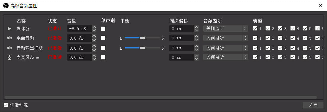 其次通过OBS的主界面音量的绿黄红三色可以快速判断音量大小。