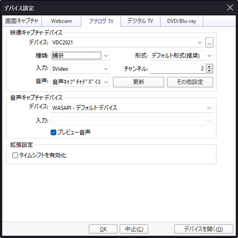 WebcamタブのデバイスでUSB Video Deviceを選択。音声キャプチャデバイスはマイク(USB Audio Device)を選びます。